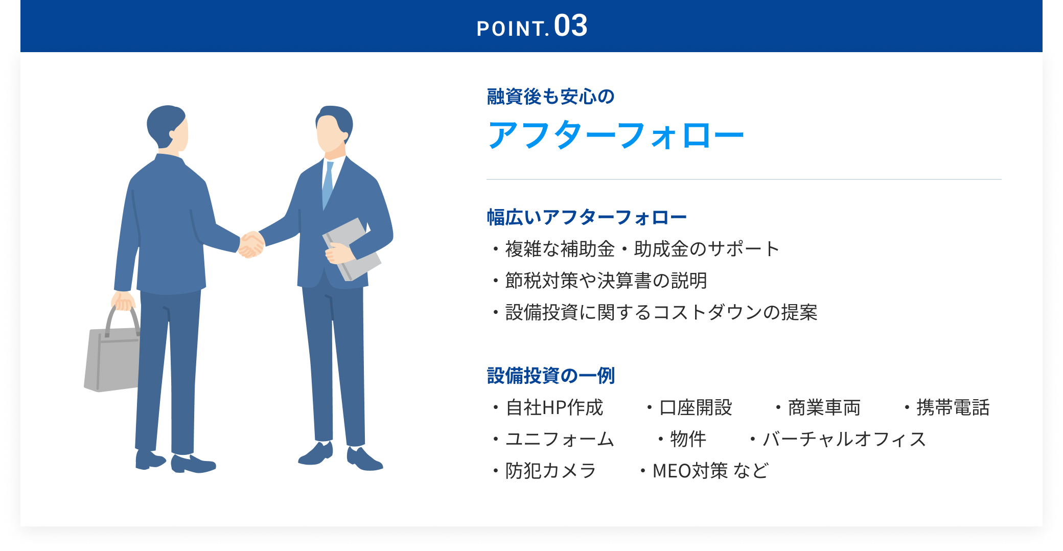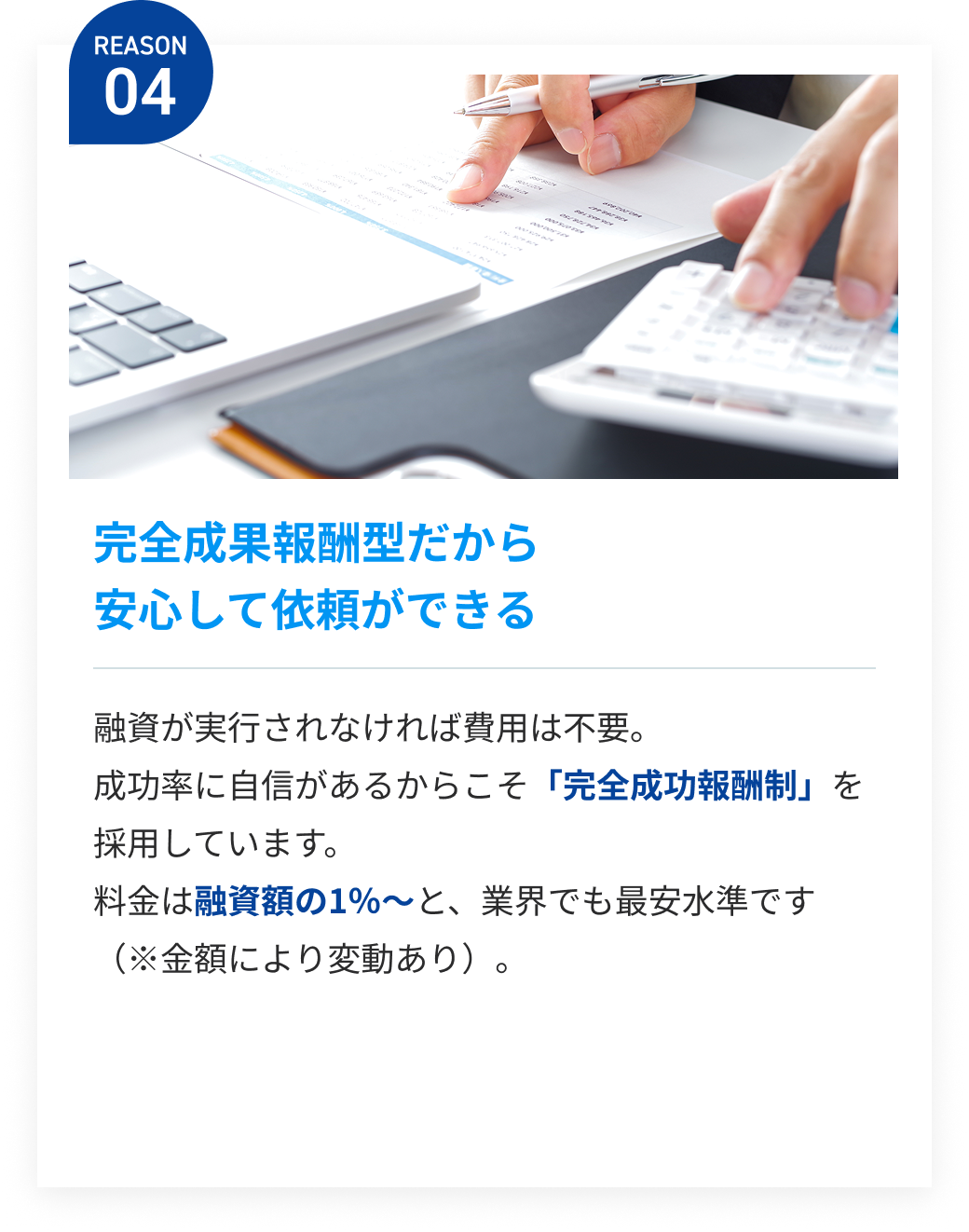 - なくても融資には影響しません。沢山の方が無担保・無保証で融資に成功しています。親族や代表者の方にも保証をつけないので安心の調達方法です。